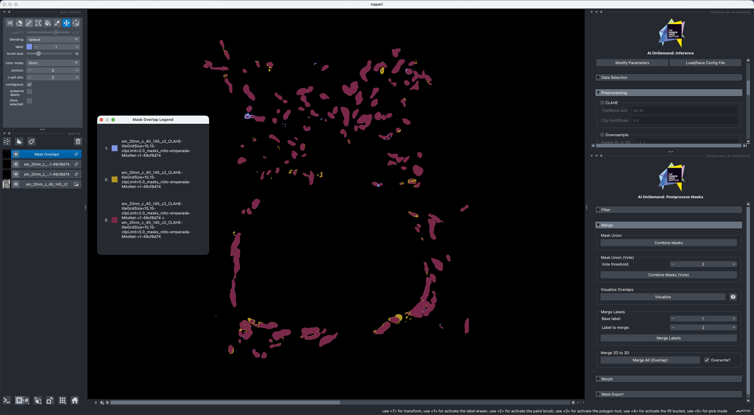 The postprocessing widget gives you various options for modifying segmentation masks. It is present just as a useful utility as requested by users, but it's functionality is purely contained within the Napari plugin and does not form apart of the wider AIoD framework. Many of these functions are inspired by the empanada-napari proofreading tools.